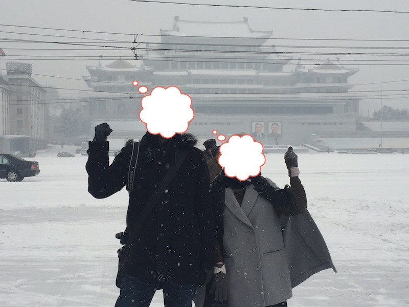 金日成広場にて先軍ポーズで記念撮影する夫婦(白目)