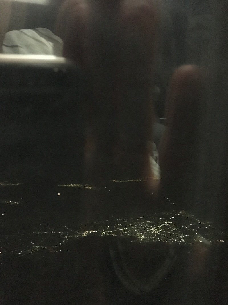 エアチャイナの窓から眼下に広がる我がふるさと甲府盆地の夜景。