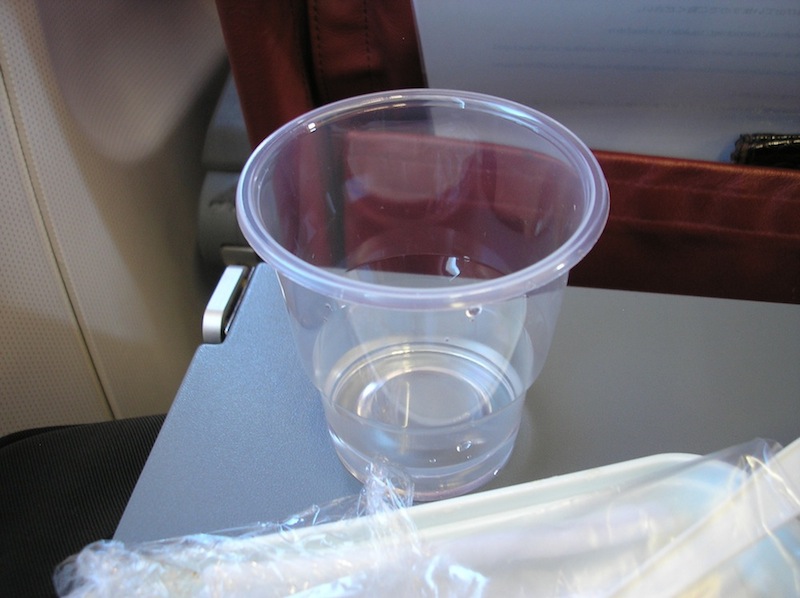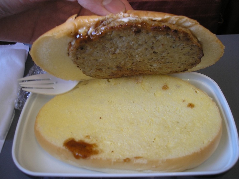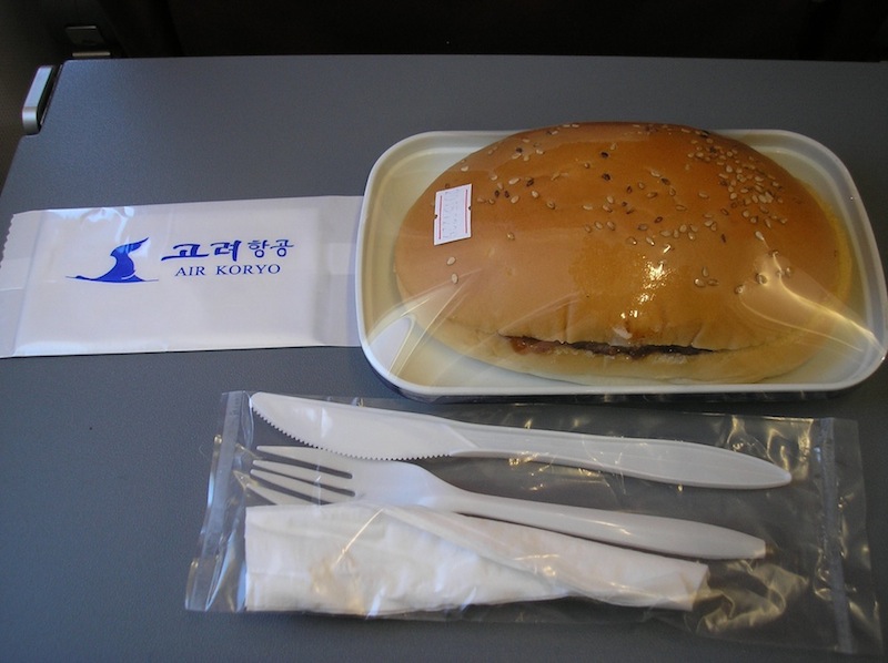 機内食はハンバーガー的な何か。ドリンクサービスは金剛山(クムガンサン)の水にしました。