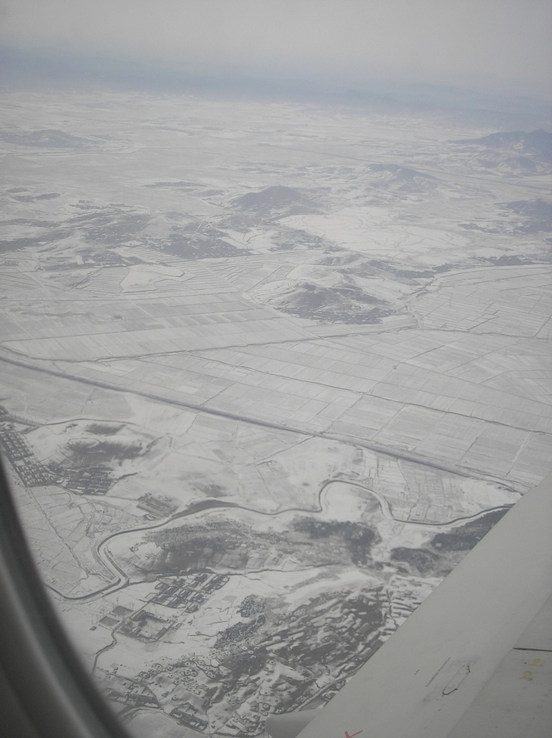 上空から見下ろす北朝鮮の大地は一面の銀世界でした。